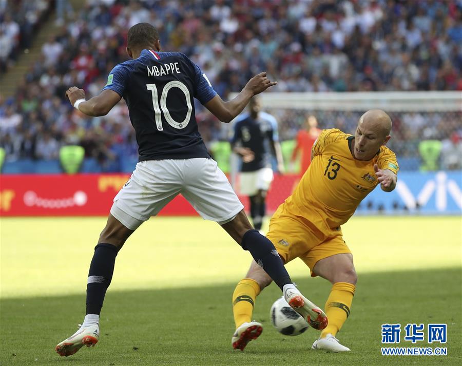 6月16日,澳大利亚队球员阿·穆伊(右)与法国队球员姆巴佩在比赛中争抢。当日,在喀山进行的2018俄罗斯世界杯足球赛C组小组赛中,法国队2-1澳大利亚队。 新华社记者吴壮摄