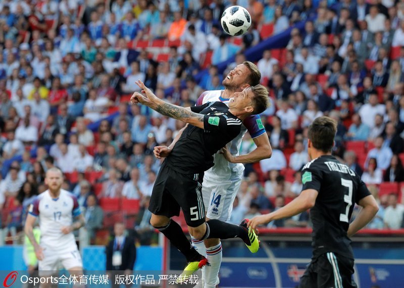 人民网北京6月16日电( 杨乔栋 实习生 谷思雨)北京时间6月16日晚,2018俄罗斯世界杯D组在莫斯科斯巴达克体育场率先展开一场角逐,由阿根廷队对阵冰岛队。上半场,阿奎罗禁区抽射破门,芬博阿松迅速扳平比分;下半场,梅西失点,并多次错失破门良机。最终全场比赛结束,阿根廷爆冷,1-1战平冰岛。(Osports全体育传媒专供人民体育 版权作品 严禁转载)