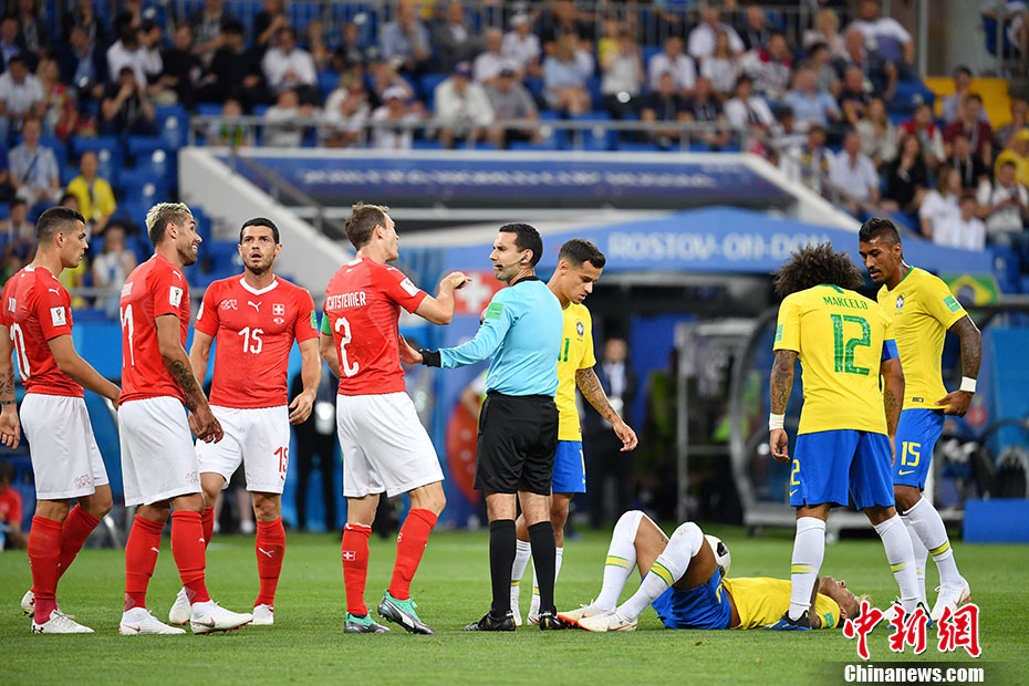 北京时间6月18日凌晨,世界杯小组赛E组首轮,巴西队对阵瑞士队。上半场,巴西队凭借库蒂尼奥禁区外的远射入网1-0领先对手。下半场,巴西队在控制上依旧占优,也形成多次有威胁地射门,但始终未能把比分扩大,反被瑞士队祖贝尔抓住角球机会头球攻门扳平比分,将1-1的比分带到终场。巴西队是本届世界杯夺冠大热门,然而此场比赛的对手瑞士队也是世界杯上的常客,目前世界排名更是高居第六,他们虽然缺乏大牌球星,但擅长整体作战。 中新社记者 毛建军 摄