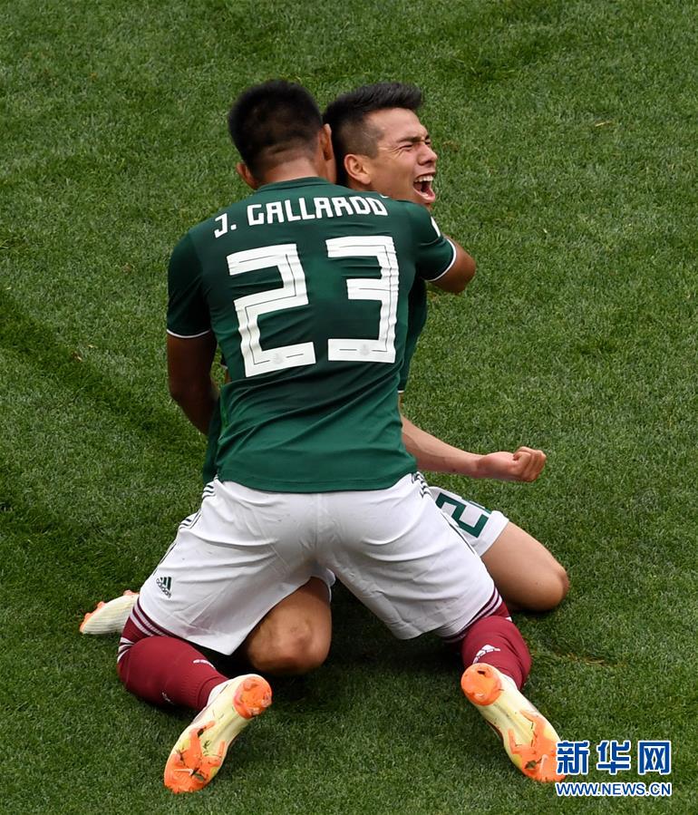 6月17日,墨西哥队球员洛萨诺(右)在比赛中与队友庆祝进球。当日,在莫斯科进行的2018俄罗斯世界杯足球赛F组小组赛中,德国队对阵墨西哥队。 新华社记者王毓国摄