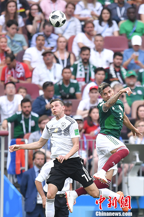 北京时间6月17日晚,世界杯小组赛F组迎来焦点之战,卫冕冠军德国队迎战墨西哥。上半场,墨西哥队防守反击相当出色,凭借洛萨诺禁区里的低射入网1-0取得领先。下半场,德国队虽多次形成围攻之势,但始终未能攻破墨西哥队的大门,本届世界杯首战爆冷,以0-1负于墨西哥。 中新社记者 田博川 摄