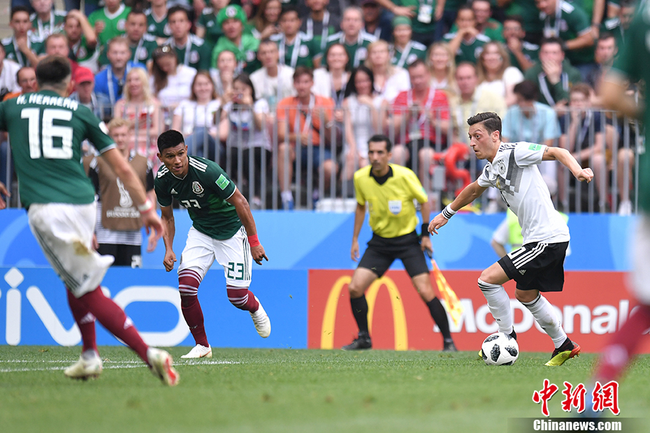北京时间6月17日晚,世界杯小组赛F组迎来焦点之战,卫冕冠军德国队迎战墨西哥。上半场,墨西哥队防守反击相当出色,凭借洛萨诺禁区里的低射入网1-0取得领先。下半场,德国队虽多次形成围攻之势,但始终未能攻破墨西哥队的大门,本届世界杯首战爆冷,以0-1负于墨西哥。图为厄齐尔拿球。 中新社记者 田博川 摄