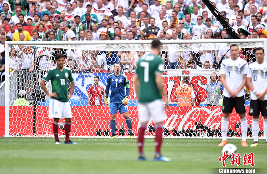 北京时间6月17日晚,世界杯小组赛F组迎来焦点之战,卫冕冠军德国队迎战墨西哥。上半场,墨西哥队防守反击相当出色,凭借洛萨诺禁区里的低射入网1-0取得领先。下半场,德国队虽多次形成围攻之势,但始终未能攻破墨西哥队的大门,本届世界杯首战爆冷,以0-1负于墨西哥。 中新社记者 田博川 摄