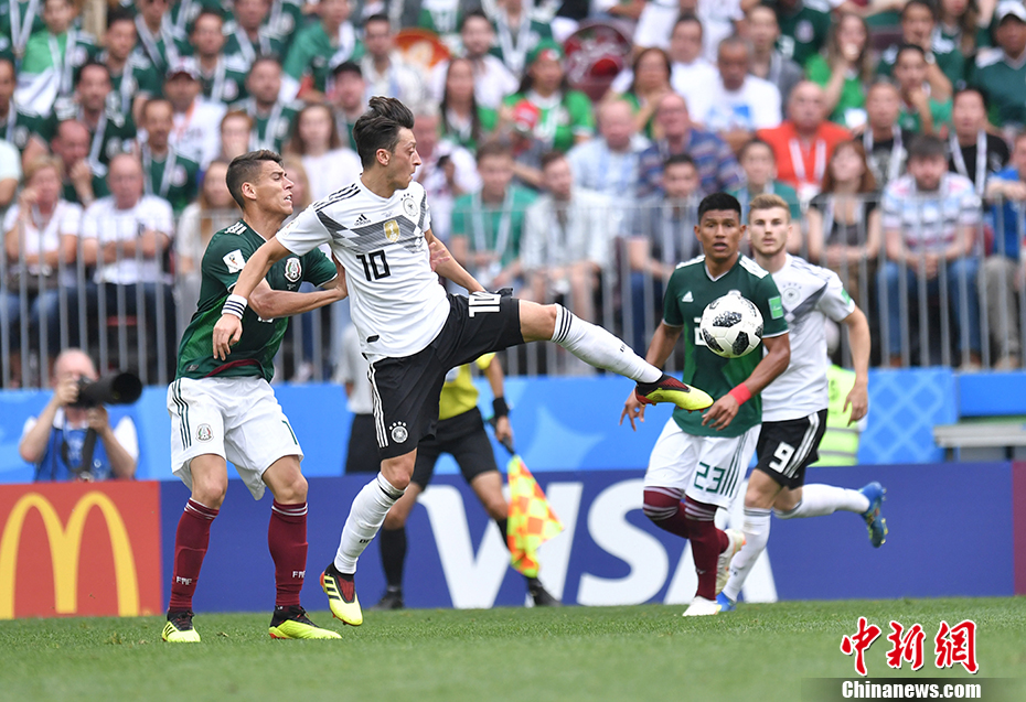 北京时间6月17日晚,世界杯小组赛F组迎来焦点之战,卫冕冠军德国队迎战墨西哥。上半场,墨西哥队防守反击相当出色,凭借洛萨诺禁区里的低射入网1-0取得领先。下半场,德国队虽多次形成围攻之势,但始终未能攻破墨西哥队的大门,本届世界杯首战爆冷,以0-1负于墨西哥。 中新社记者 田博川 摄