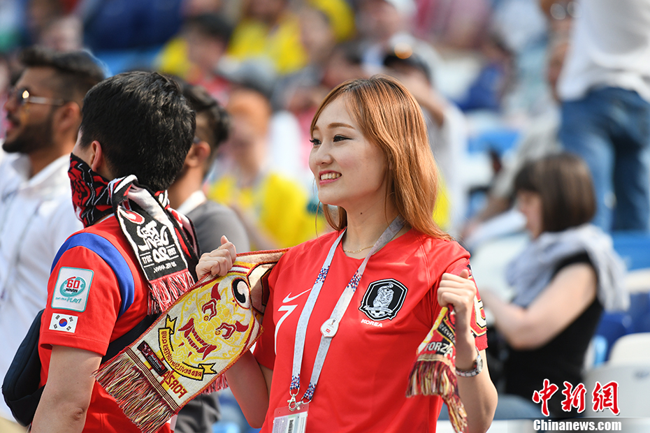 北京时间6月18日晚,2018俄罗斯世界杯F组首轮韩国队与瑞典队的较量在下诺夫哥罗德打响。美女球迷成别样风景。 中新社记者 田博川 摄