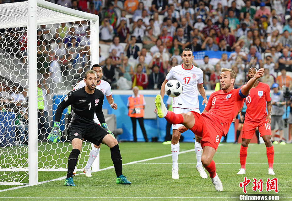 北京时间6月19日凌晨,俄罗斯世界杯小组赛G组突尼斯与英格兰的较量在伏尔加格勒打响。上半场凯恩补射破门为英格兰队首开纪录,随后英格兰后卫沃克送上点球大礼,突尼斯由萨西主罚命中。下半时,凯恩在91分钟攻破突尼斯球门。最终“三狮军团”英格兰队2-1绝杀突尼斯。图为凯恩在球门前。 中新社记者 毛建军 摄