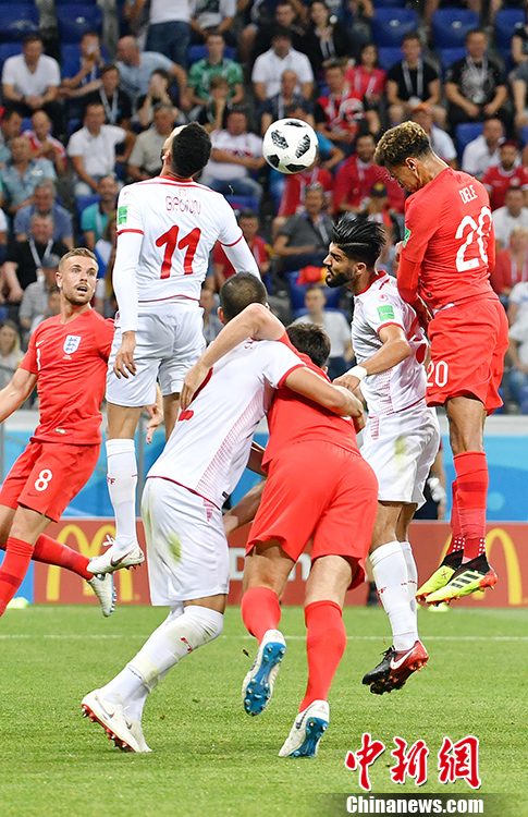 北京时间6月19日凌晨,俄罗斯世界杯小组赛G组突尼斯与英格兰的较量在伏尔加格勒打响。上半场凯恩补射破门为英格兰队首开纪录,随后英格兰后卫沃克送上点球大礼,突尼斯由萨西主罚命中。下半时,凯恩在91分钟攻破突尼斯球门。最终“三狮军团”英格兰队2-1绝杀突尼斯。 中新社记者 毛建军 摄