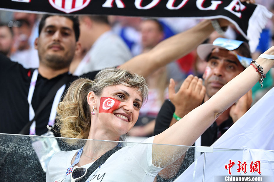 北京时间6月19日凌晨,俄罗斯世界杯小组赛G组突尼斯与英格兰的较量在伏尔加格勒打响。图为看台上的突尼斯球迷。 中新社记者 毛建军 摄