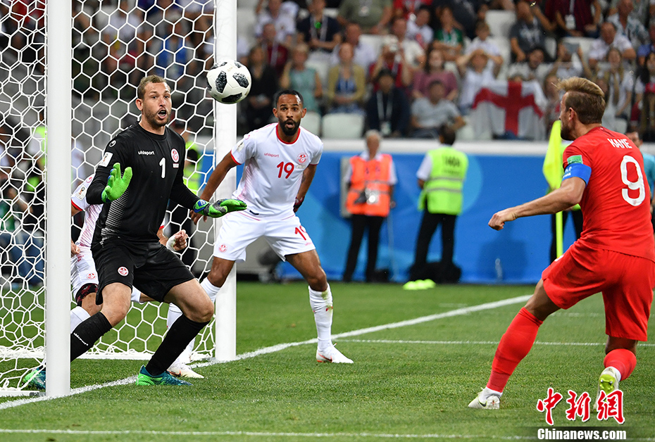 北京时间6月19日凌晨,俄罗斯世界杯小组赛G组突尼斯与英格兰的较量在伏尔加格勒打响。上半场凯恩补射破门为英格兰队首开纪录,随后英格兰后卫沃克送上点球大礼,突尼斯由萨西主罚命中。下半时,凯恩在91分钟攻破突尼斯球门。最终“三狮军团”英格兰队2-1绝杀突尼斯。图为绝杀瞬间。 中新社记者 毛建军 摄