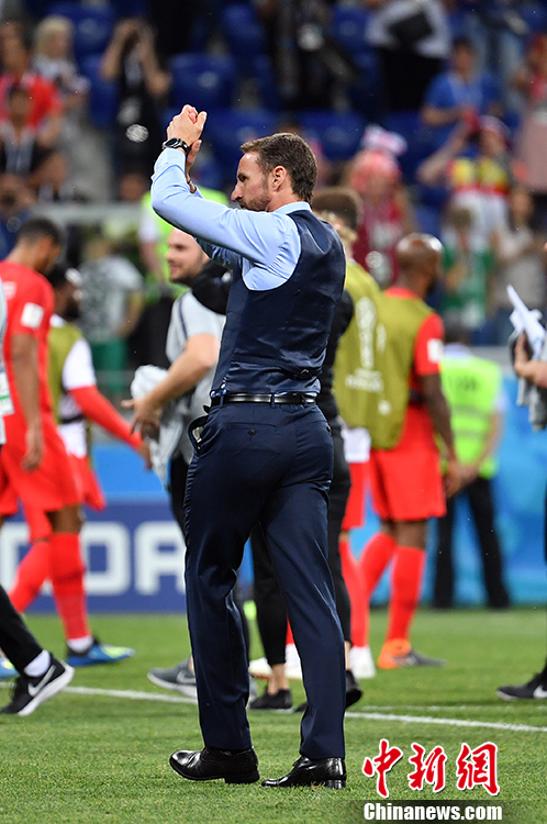 英格兰球迷庆祝胜利,主教练索斯盖特感谢球迷。 中新社记者 毛建军 摄
