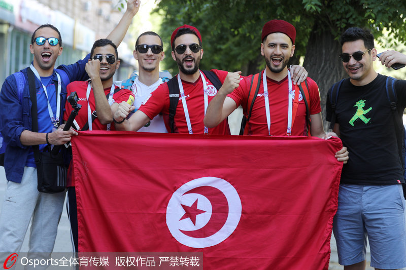 人民网北京6月19日电(杨乔栋 实习生 谷思雨)北京时间6月19日凌晨,2018年俄罗斯世界杯小组赛G组比赛继续进行,G组赛突尼斯将在北京时间凌晨2点与英格兰展开对决。赛前,双方球迷用自己喜爱的装扮出场,突尼斯球迷用音乐敲响进场的节奏,给支持的球队加油助阵。(Osports全体育传媒专供人民体育 版权作品 严禁转载)