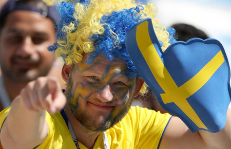 6月18日,瑞典队球迷为球队助威。当日,在下诺夫哥罗德进行的2018俄罗斯世界杯足球赛F组小组赛中,瑞典队对阵韩国队。
