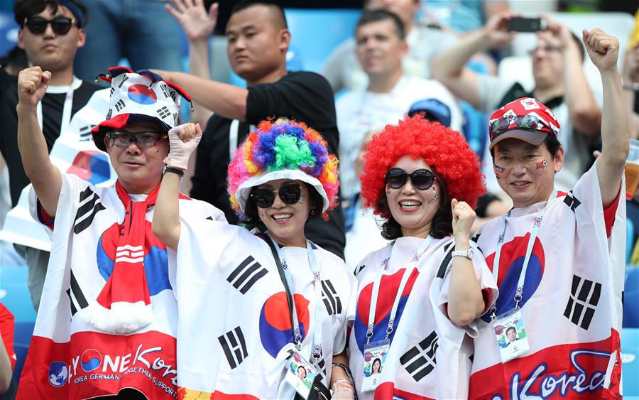 6月18日,韩国队球迷为球队助威。当日,在下诺夫哥罗德进行的2018俄罗斯世界杯足球赛F组小组赛中,瑞典队对阵韩国队。