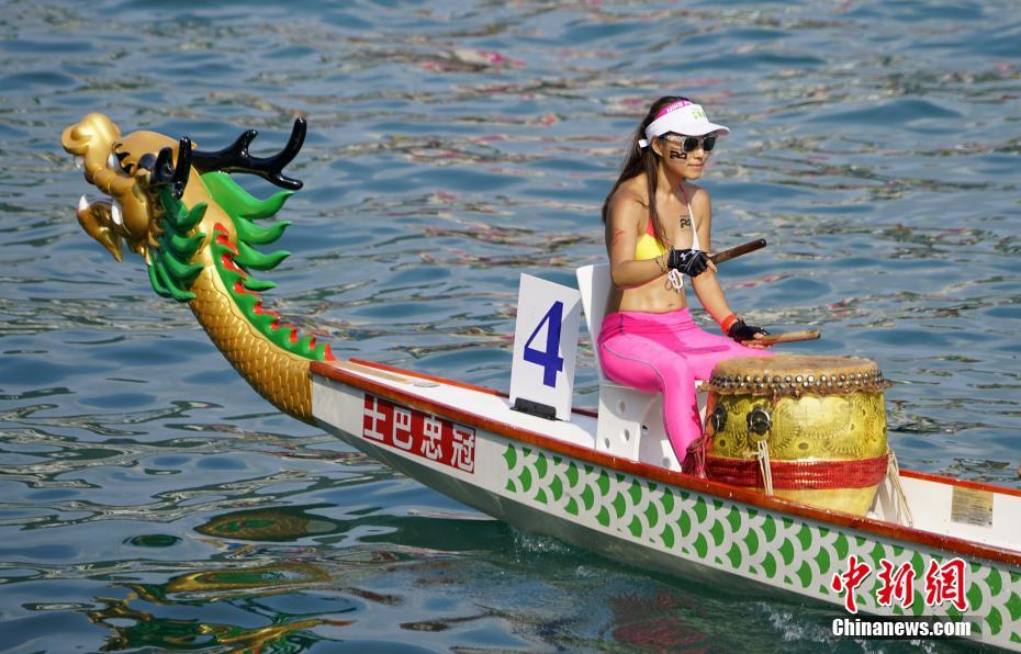 6月18日正值端午节,逾百年历史的香港仔龙舟竞渡大赛在香港仔避风塘举行。该龙舟赛是香港最具传统渔港特色的龙舟赛。全日赛事共33场,其中有十支大木龙舟队参加比赛,大龙参赛规模为全港之最。图为比基尼女郎担纲龙舟敲鼓手。 中新社记者 张炜 摄