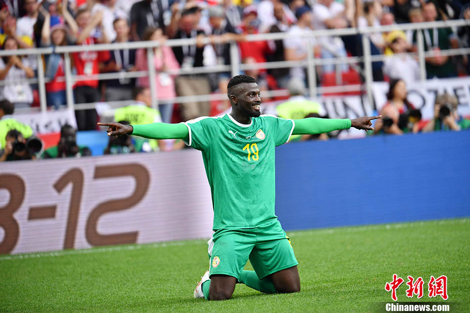 北京时间6月19日晚,2018世界杯小组赛H组首轮,波兰队在莫斯科斯巴达克体育场迎战特兰加雄狮塞内加尔队,这也是世界杯32强中最后两支球队登场亮相。上半场,波兰虽然一度占据了进攻优势,但塞内加尔凭借着他们的速度和身体优势打开了局面,盖耶的远射造成对手的乌龙进球帮助塞内加尔1-0半场领先波兰。下半时,波兰队回传出现失误,尼昂前场断球推射空门再进一球,波兰队随后大举反攻,第86分钟波兰队头球入网,扳回一球。最终塞内加尔队2-1力克波兰,收获3分。图为尼昂庆祝进球。 中新社记者 毛建军 摄