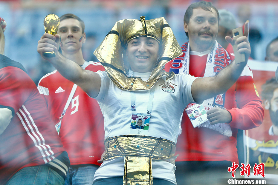 当地时间6月19日,2018俄罗斯世界杯小组赛A组俄罗斯对阵埃及的比赛将在圣彼得堡体育场举行。图为赛前看台上“法老”装扮的埃及球迷。 中新社记者 富田 摄