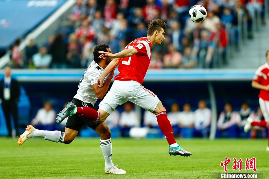北京时间6月20日凌晨,世界杯小组赛A组第二轮一场比赛在东道主俄罗斯队和埃及队间进行。凭借下半时埃及队的自摆乌龙以及切里舍夫和久巴的进球,俄罗斯队三球领先,随后萨拉赫点射破门为埃及队扳回一城,最终俄罗斯队3-1战胜埃及,积6分极有可能提前一轮小组出线。 中新社记者 富田 摄