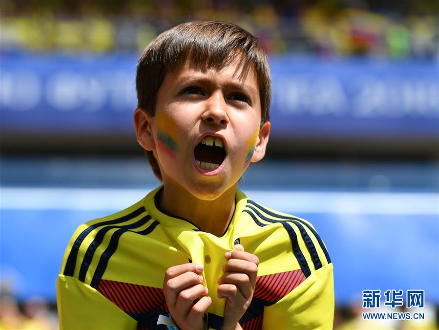 ↑6月19日,哥伦比亚队小球迷在比赛前为球队造势。 当日,在萨兰斯克进行的2018俄罗斯世界杯足球赛H组小组赛中,哥伦比亚队对阵日本队。新华社记者吕小炜摄