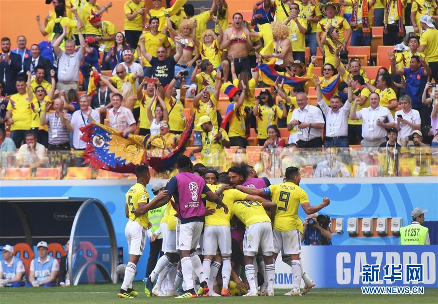 ↑6月19日,哥伦比亚队球员在比赛中庆祝进球。 当日,在萨兰斯克进行的2018俄罗斯世界杯足球赛H组小组赛中,哥伦比亚队对阵日本队。新华社记者吕小炜摄