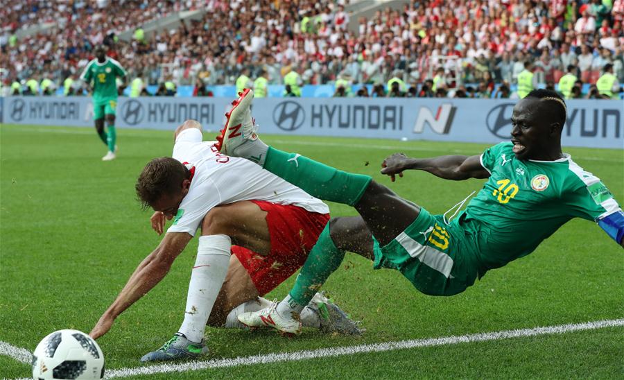↑6月19日,塞内加尔队球员马内(右)与波兰队球员乔内克在比赛中拼抢。当日,在莫斯科进行的2018俄罗斯世界杯足球赛H组小组赛中,塞内加尔队以2比1战胜波兰队。 新华社记者徐子鉴摄