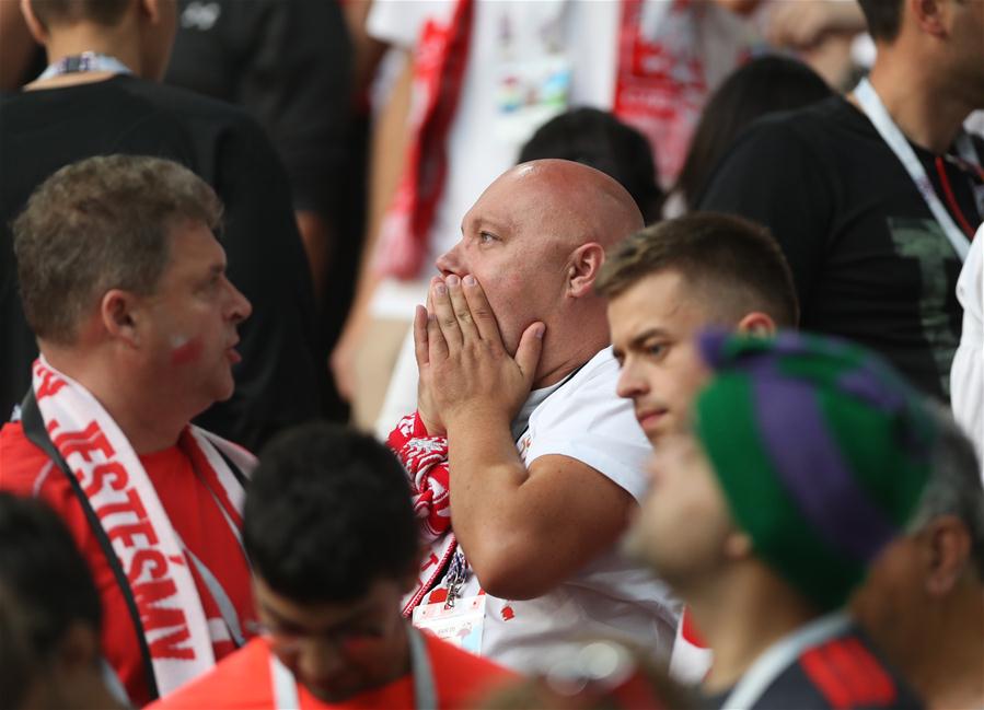 ↑6月19日,波兰队球迷在比赛后。当日,在莫斯科进行的2018俄罗斯世界杯足球赛H组小组赛中,波兰队以1比2不敌塞内加尔队。 新华社记者费茂华摄