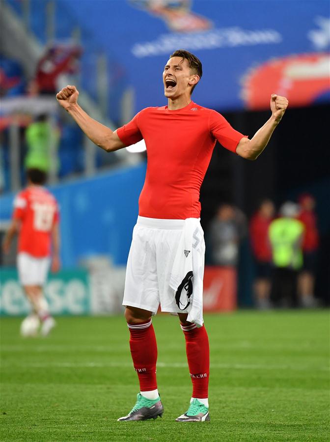 ↑6月19日,俄罗斯队球员库捷波夫在比赛后庆祝胜利。当日,在圣彼得堡进行的2018俄罗斯世界杯足球赛A组小组赛中,俄罗斯队以3比1战胜埃及队,取得两连胜。 新华社记者李尕摄