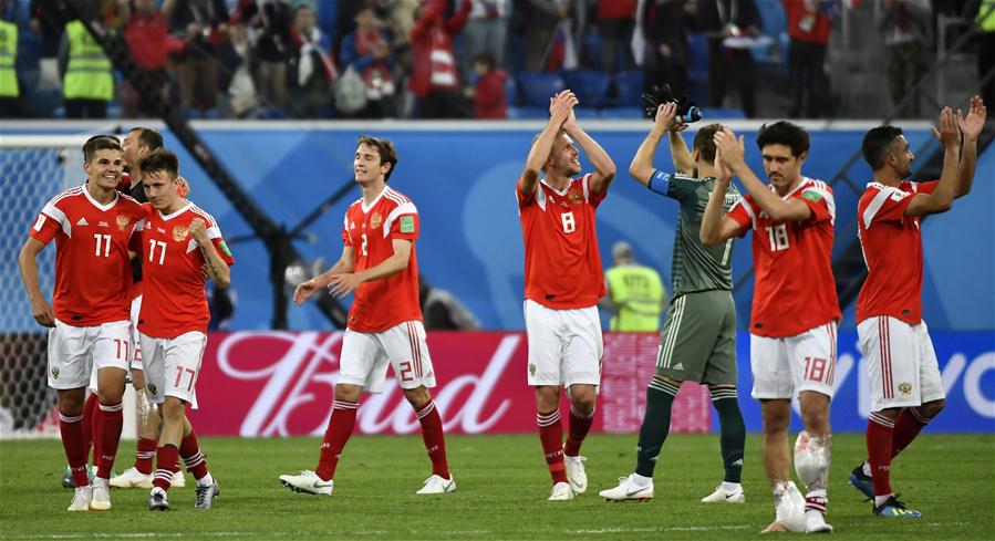 ↑6月19日,俄罗斯队球员在比赛后向观众致意。当日,在圣彼得堡进行的2018俄罗斯世界杯足球赛A组小组赛中,俄罗斯队以3比1战胜埃及队,取得两连胜。 新华社记者陈益宸摄
