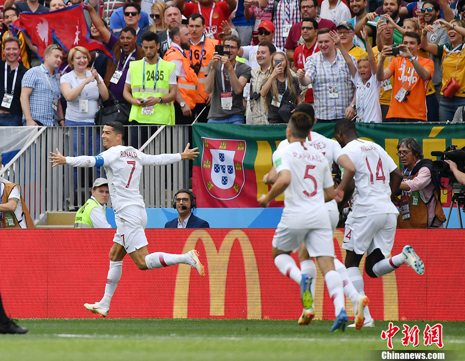 北京时间6月20日晚,2018俄罗斯世界杯B组次轮葡萄牙队与摩洛哥队的较量在莫斯科卢日尼基体育场打响。凭借C罗两场比赛以来的第4个进球,葡萄牙队1-0击败对手,积4分暂时升至小组榜首。而摩洛哥队两战皆负,成为本届世界杯第一支被淘汰的球队。图为C罗庆祝进球。 中新社记者 毛建军 摄
