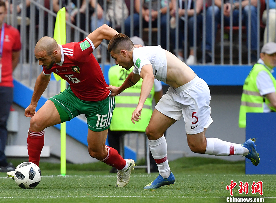 摩洛哥队首轮迎战伊朗,在全场局面占优的情况下,球队却在伤停补时的最后一刻以一记乌龙球送对手绝杀。此役摩洛哥队必须拼死一战,若再遭败绩极有可能提前一轮小组出局。图为双方队员互相拉扯。 中新社记者 毛建军 摄