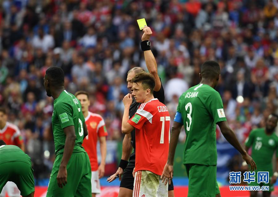 ↑世界杯首轮过后,“第一球”、“第一红”、“第一帽”等纷纷出炉。让我们一起来盘点本届世界杯上的那些“第一”。这是6月14日,俄罗斯队球员戈洛文(中)在比赛中得到黄牌。这是本届世界杯上的第一张黄牌。当日,在莫斯科进行的2018俄罗斯世界杯揭幕战中,俄罗斯队以5比0战胜沙特阿拉伯队。新华社记者陈诚摄