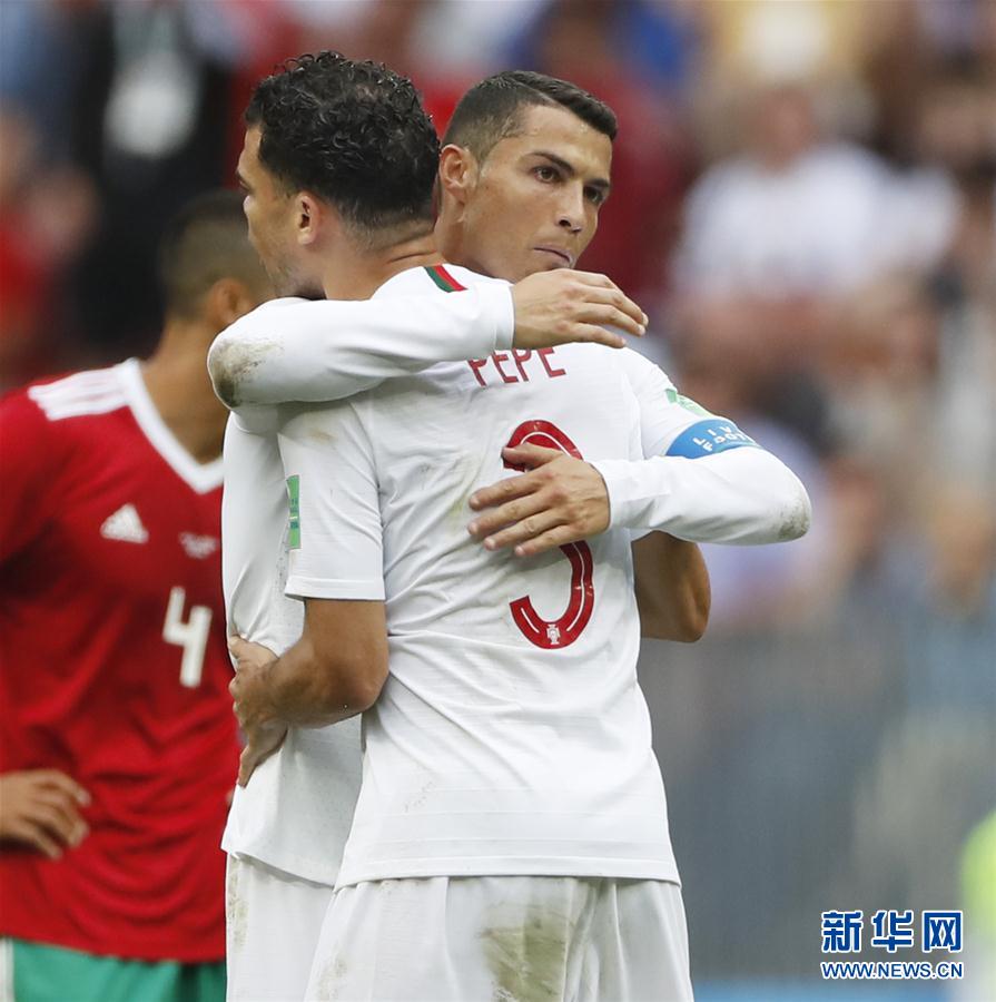 6月20日,葡萄牙队球员克·罗纳尔多(右)与队友佩佩在比赛后庆祝胜利。当日,在莫斯科进行的2018俄罗斯世界杯足球赛B组小组赛中,葡萄牙队以1比0战胜摩洛哥队。 新华社记者曹灿摄