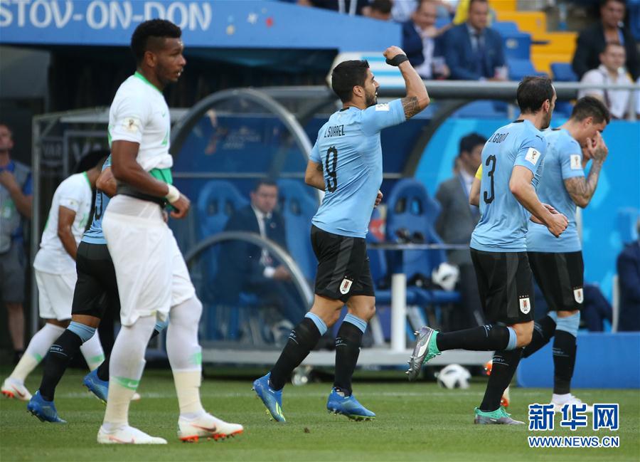 6月20日,乌拉圭队球员苏亚雷斯(中)在比赛中庆祝进球。当日,在顿河畔罗斯托夫进行的2018俄罗斯世界杯足球赛A组小组赛中,乌拉圭队对阵沙特阿拉伯队。 新华社记者李明摄