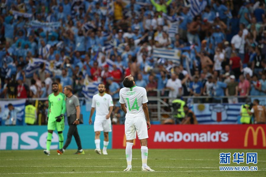 ↑6月20日,沙特阿拉伯队球员奥泰耶夫(前中)在比赛后情绪低落。当日,在顿河畔罗斯托夫进行的2018俄罗斯世界杯足球赛A组小组赛中,乌拉圭队以1比0战胜沙特阿拉伯队。 新华社记者李明摄