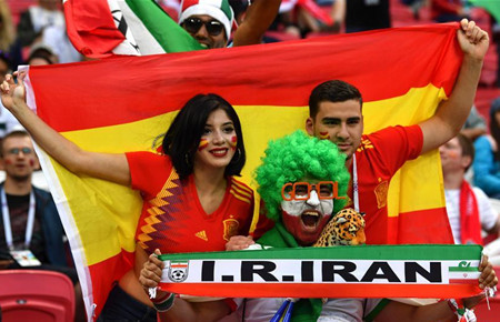 ↑6月20日,伊朗队与西班牙队的球迷在比赛前合影。当日,在喀山进行的2018俄罗斯世界杯足球赛B组小组赛中,伊朗队对阵西班牙队。 新华社记者陈诚摄