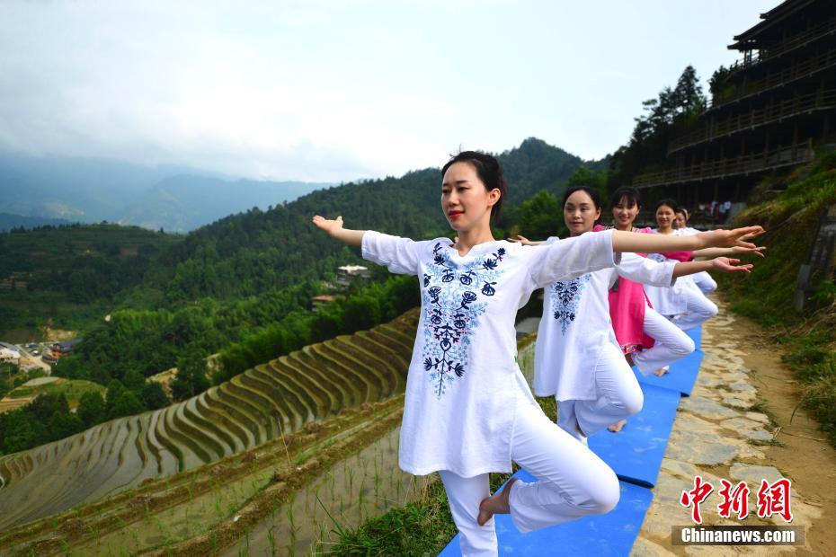 广西龙胜梯田上秀瑜伽