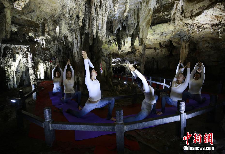 6月21日,国际瑜伽日,湖南省张家界市武陵源区的瑜伽爱好者在享有“世界溶洞奇观”美誉的黄龙洞内练习瑜伽,展示秀美身姿,感受瑜伽的魅力。黄龙洞位于武陵源风景名胜区内,属典型的喀斯特岩溶地貌,现已探明洞底总面积10万平方米。吴勇兵 摄