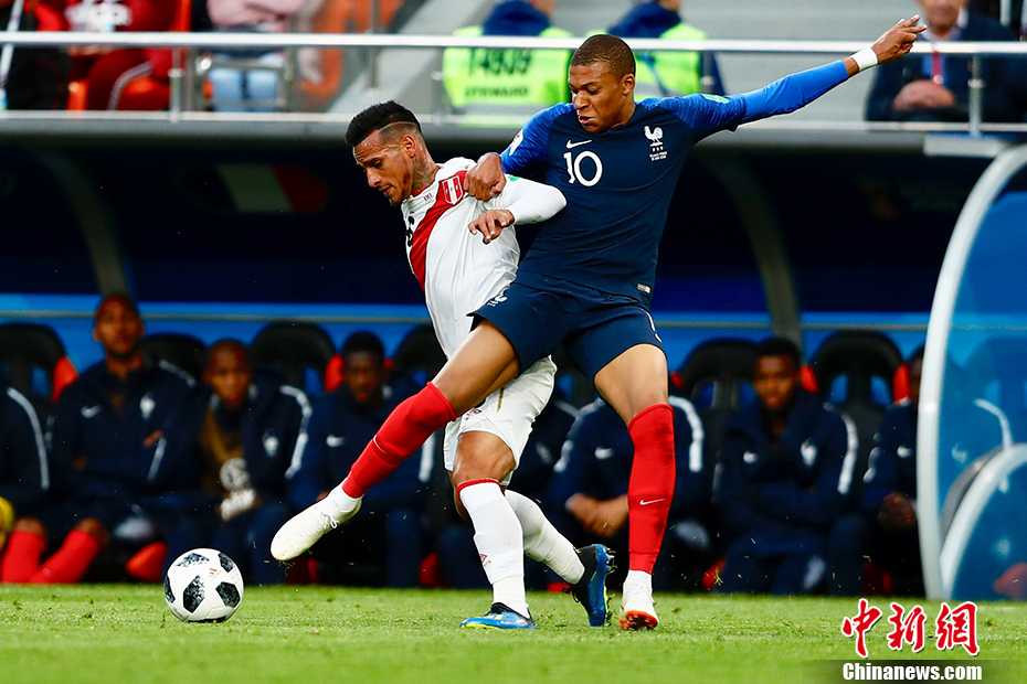北京时间6月21日晚,俄罗斯世界杯C组次轮展开较量,首轮取得开门红的法国队在叶卡特琳堡迎战秘鲁。法国队凭借姆巴佩个人的世界杯首粒进球,1-0战胜秘鲁队。法国队小组积6分率先晋级,秘鲁两战皆负无缘淘汰赛。 中新社记者 富田 摄