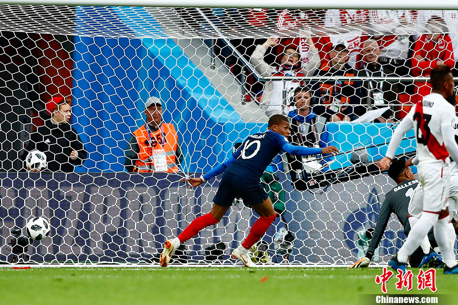 比分的改变出现在第34分钟,法国队前场抢断,吉鲁扫射被秘鲁后卫铲抢后反弹到门前,姆巴佩无人防守,轻松破空门得手,19岁的姆巴佩打进世界杯首球。凭借此球,法国队1-0结束上半场比赛。 中新社记者 富田 摄