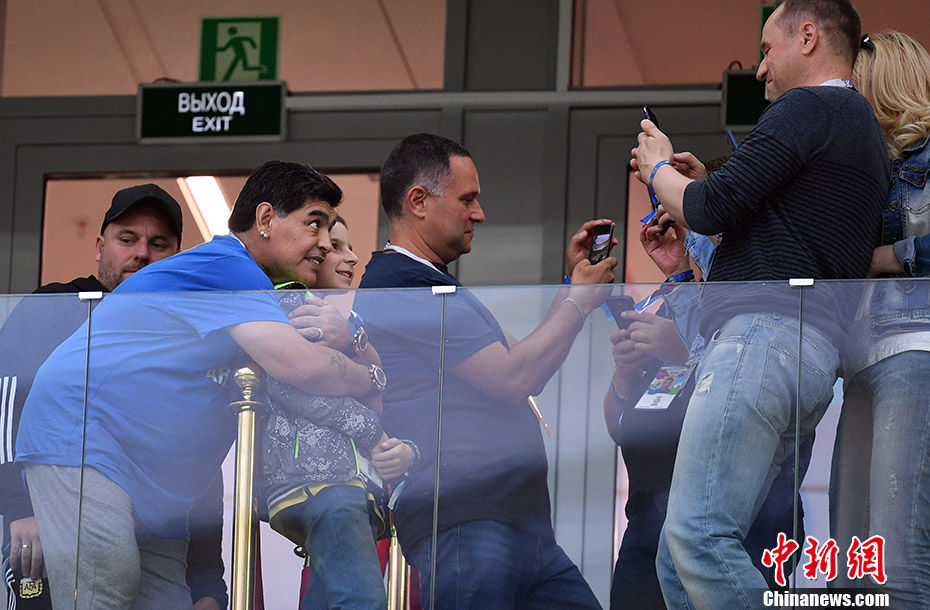 马拉多纳在包厢中拍照。 中新社记者 毛建军 摄