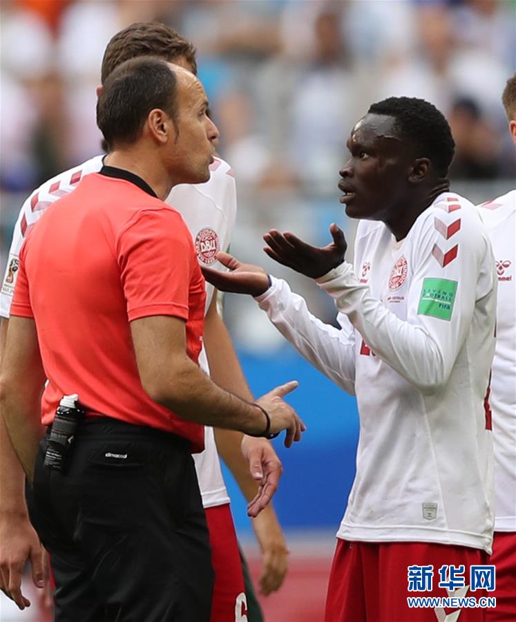 ↑6月21日,丹麦队球员皮·西斯托(右)在比赛中被出示黄牌后与主裁判理论。当日,在萨马拉进行的2018俄罗斯世界杯足球赛C组小组赛中,澳大利亚队对阵丹麦队。 新华社记者费茂华摄