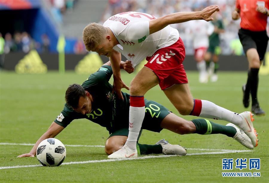 ↑6月21日,丹麦队球员安·科尔内留斯(上)与澳大利亚队球员塞恩斯伯里在比赛中拼抢。当日,在萨马拉进行的2018俄罗斯世界杯足球赛C组小组赛中,澳大利亚队对阵丹麦队。 新华社记者费茂华摄