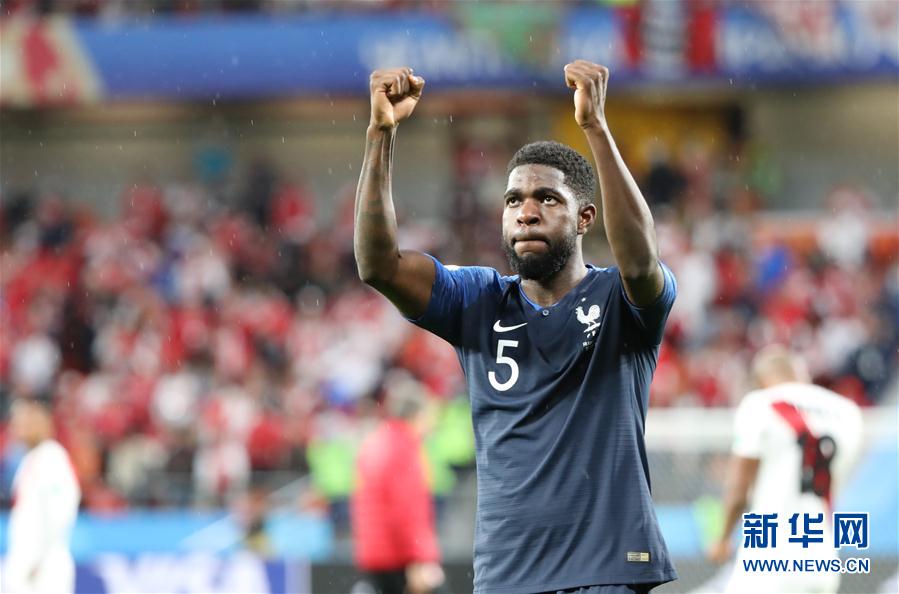 6月21日,法国队球员乌姆蒂蒂在比赛后庆祝胜利。当日,在叶卡捷琳堡进行的2018俄罗斯世界杯足球赛C组小组赛中,法国队以1比0战胜秘鲁队。 新华社记者白雪骐摄