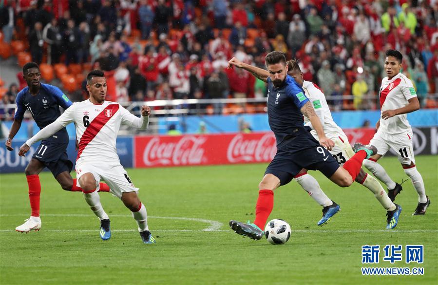6月21日,法国队球员吉鲁(右三)在比赛中射门。当日,在叶卡捷琳堡进行的2018俄罗斯世界杯足球赛C组小组赛中,法国队以1比0战胜秘鲁队。 新华社记者白雪骐摄