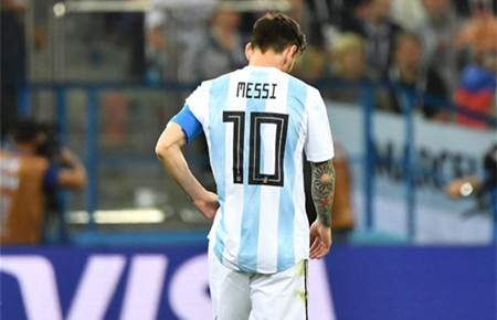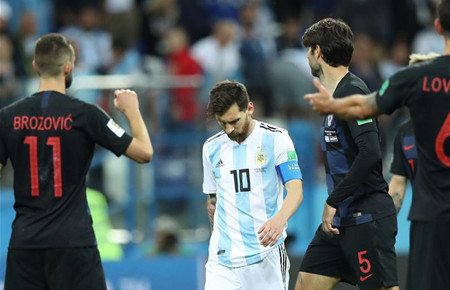 ↑6月21日,阿根廷队球员梅西(左二)在比赛结束后离场。当日,在下诺夫哥罗德进行的2018俄罗斯世界杯足球赛D组小组赛中,克罗地亚队以3比0击败阿根廷队。 新华社记者吴壮摄