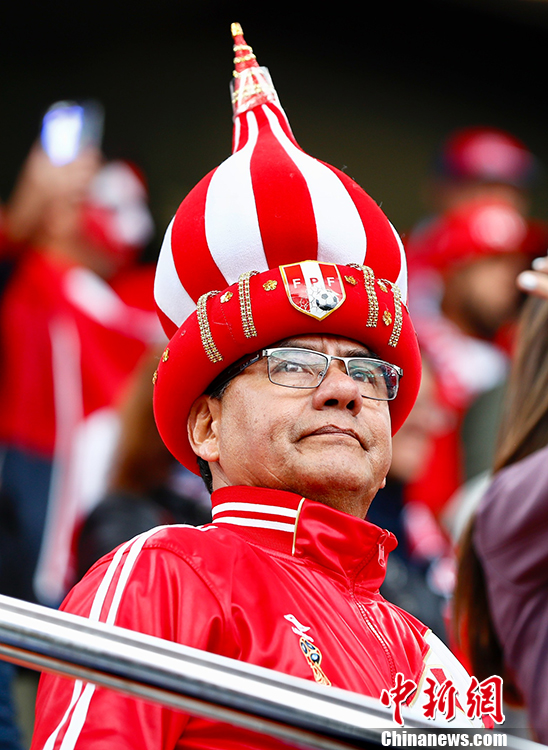 当地时间6月21日,世界杯小组赛法国队对阵秘鲁队的比赛即将在叶卡捷琳堡体育场打响。赛前,各式装扮的秘鲁球迷格外引人注目。 中新社记者 富田 摄
