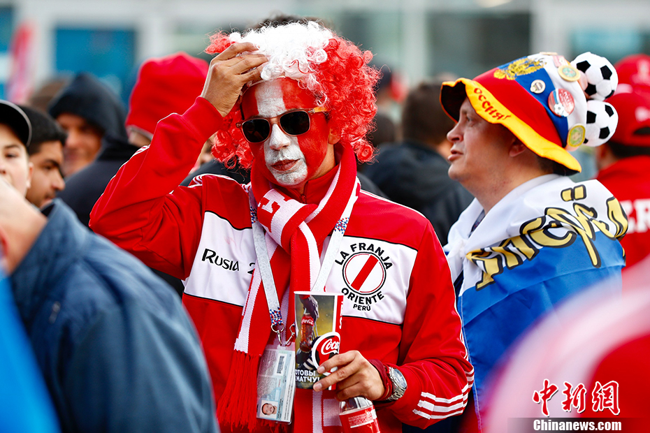当地时间6月21日,世界杯小组赛法国队对阵秘鲁队的比赛即将在叶卡捷琳堡体育场打响。赛前,各式装扮的秘鲁球迷格外引人注目。 中新社记者 富田 摄