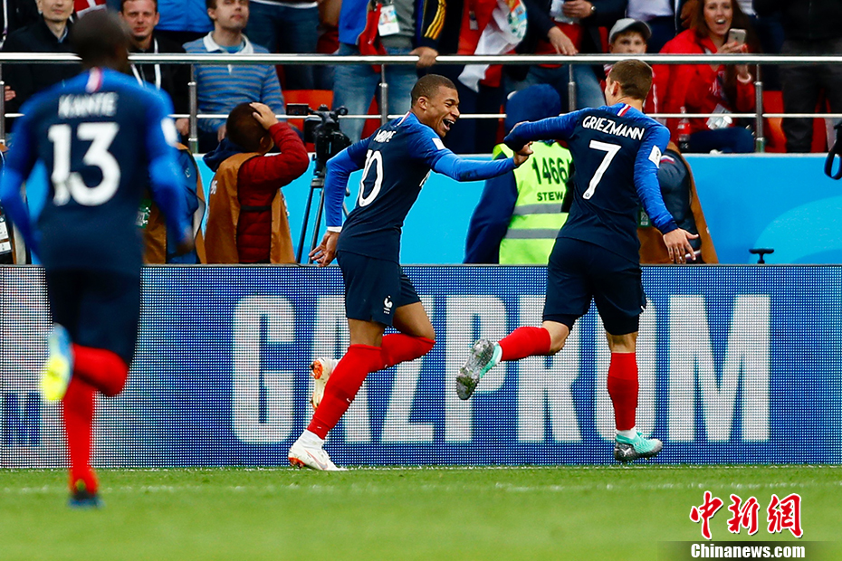 北京时间6月21日晚,俄罗斯世界杯C组次轮展开较量,首轮取得开门红的法国队在叶卡特琳堡迎战秘鲁。法国队凭借姆巴佩个人的世界杯首粒进球,1-0战胜秘鲁队。法国队小组积6分率先晋级,秘鲁两战皆负无缘淘汰赛。 中新社记者 富田 摄