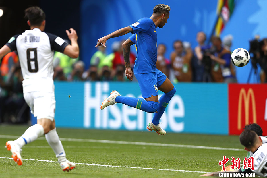 北京时间6月22日晚,2018俄罗斯世界杯E组次轮巴西队与哥斯达黎加队的较量在圣彼得堡打响。内马尔在比赛第77分钟为巴西队赢得点球,但通过VAR技术回看,当值主裁取消了点球判罚。进入伤停补时后库蒂尼奥打破僵局,内马尔锦上添花,助巴西队2-0取胜。图为内马尔彩虹过人。 中新社记者 富田 摄