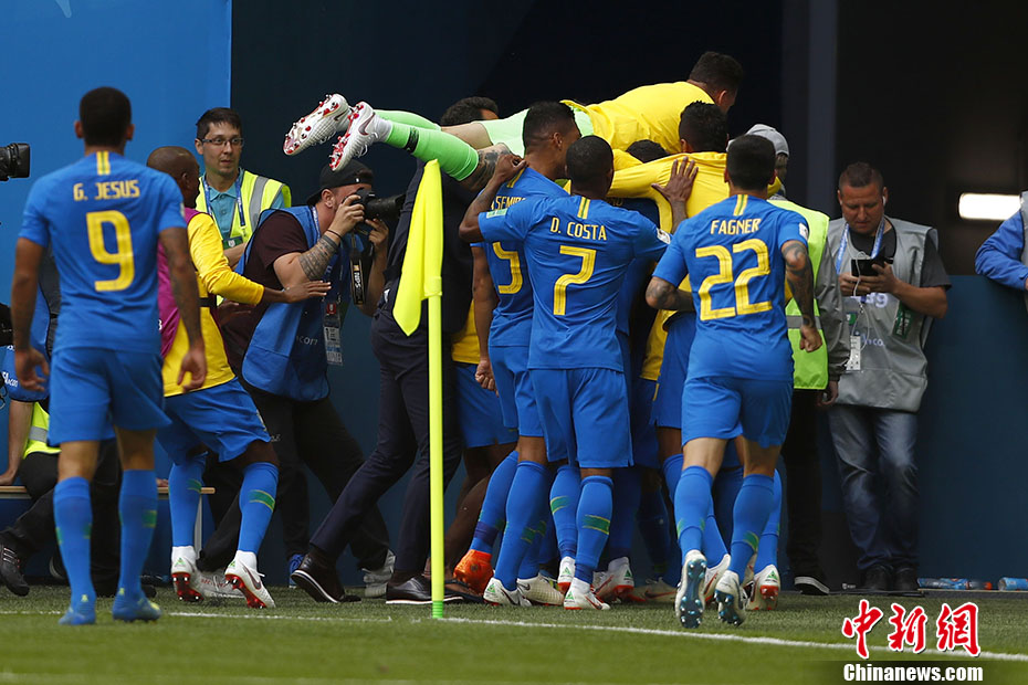巴西队庆祝胜利。 中新社记者 富田 摄