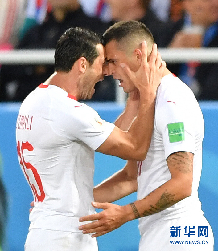 ↑6月22日,瑞士队球员扎卡(右)在破门后与队友庆祝。当日,在加里宁格勒进行的2018俄罗斯世界杯足球赛E组小组赛中,塞尔维亚队对阵瑞士队。 新华社记者刘大伟摄